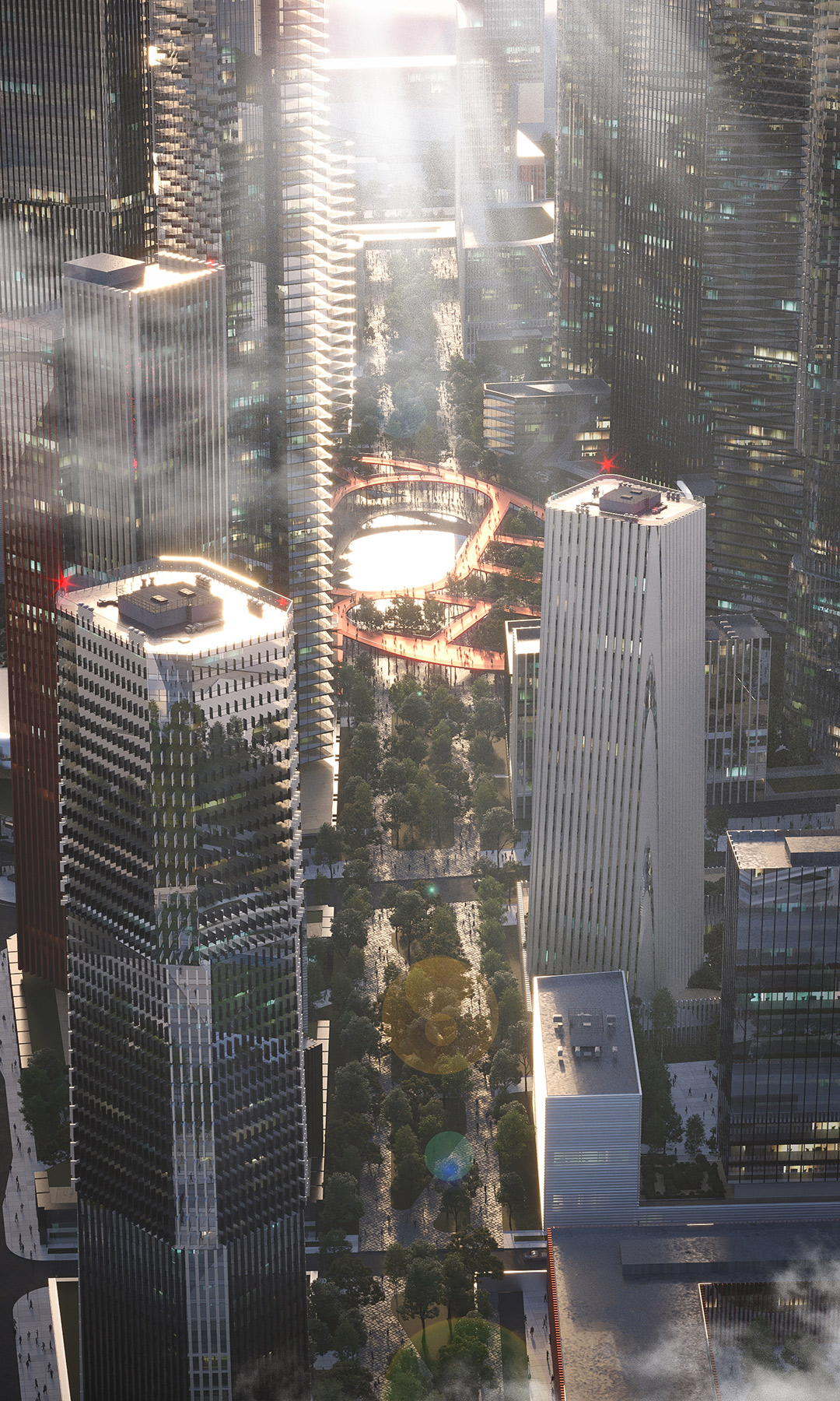 The main principle behind the creation of the master plan is the formation of a vibrant urban terrain, unified by a central pedestrian artery — a boulevard. Within the rigid modular grid of varied block types, a landscaped oasis — the central park — is carved out.