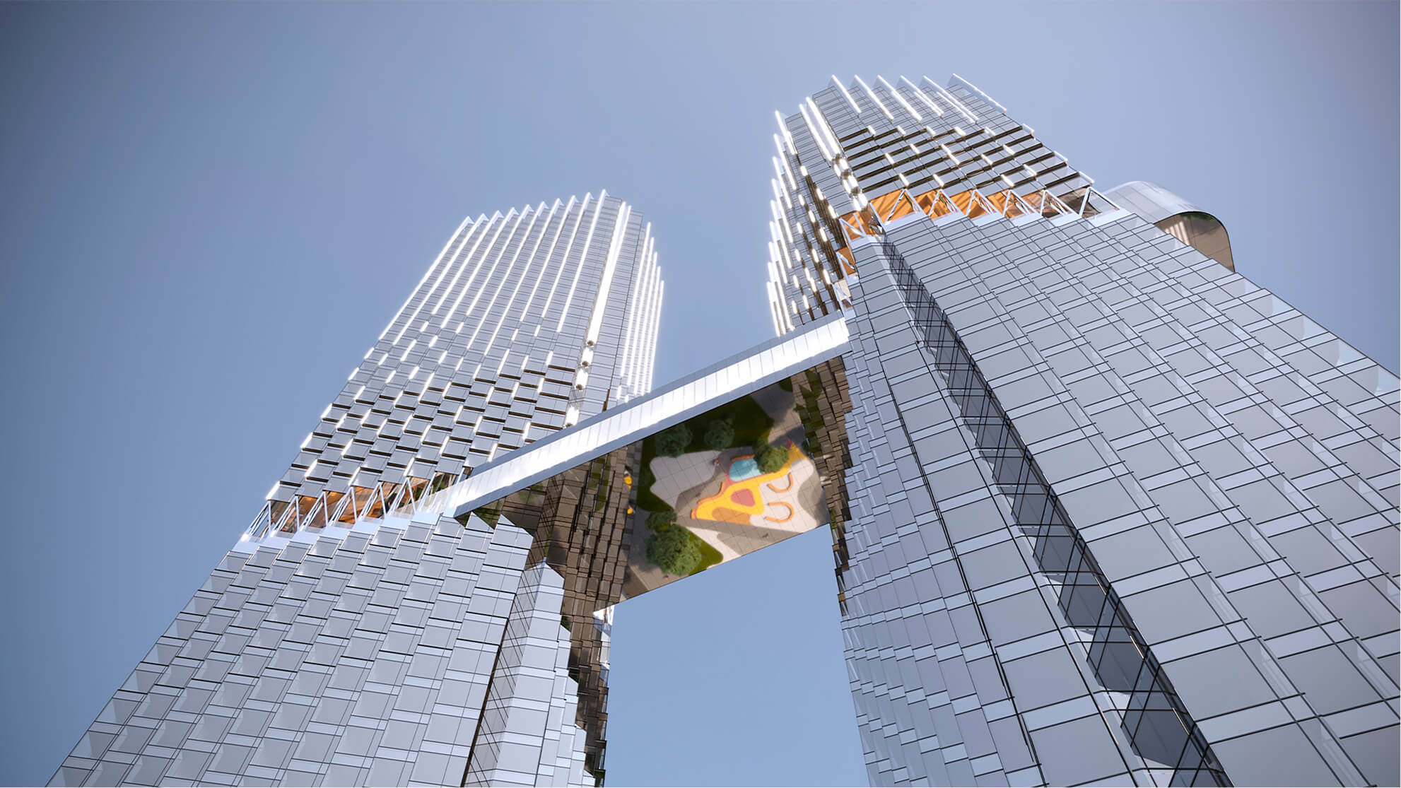 HideOUT – это новый формат высоток будущего, формирующих фасад Москвы, городская инсталляция. Силуэт башен динамичен – мост как сустав пронзает башни на высоте 22 этажа.