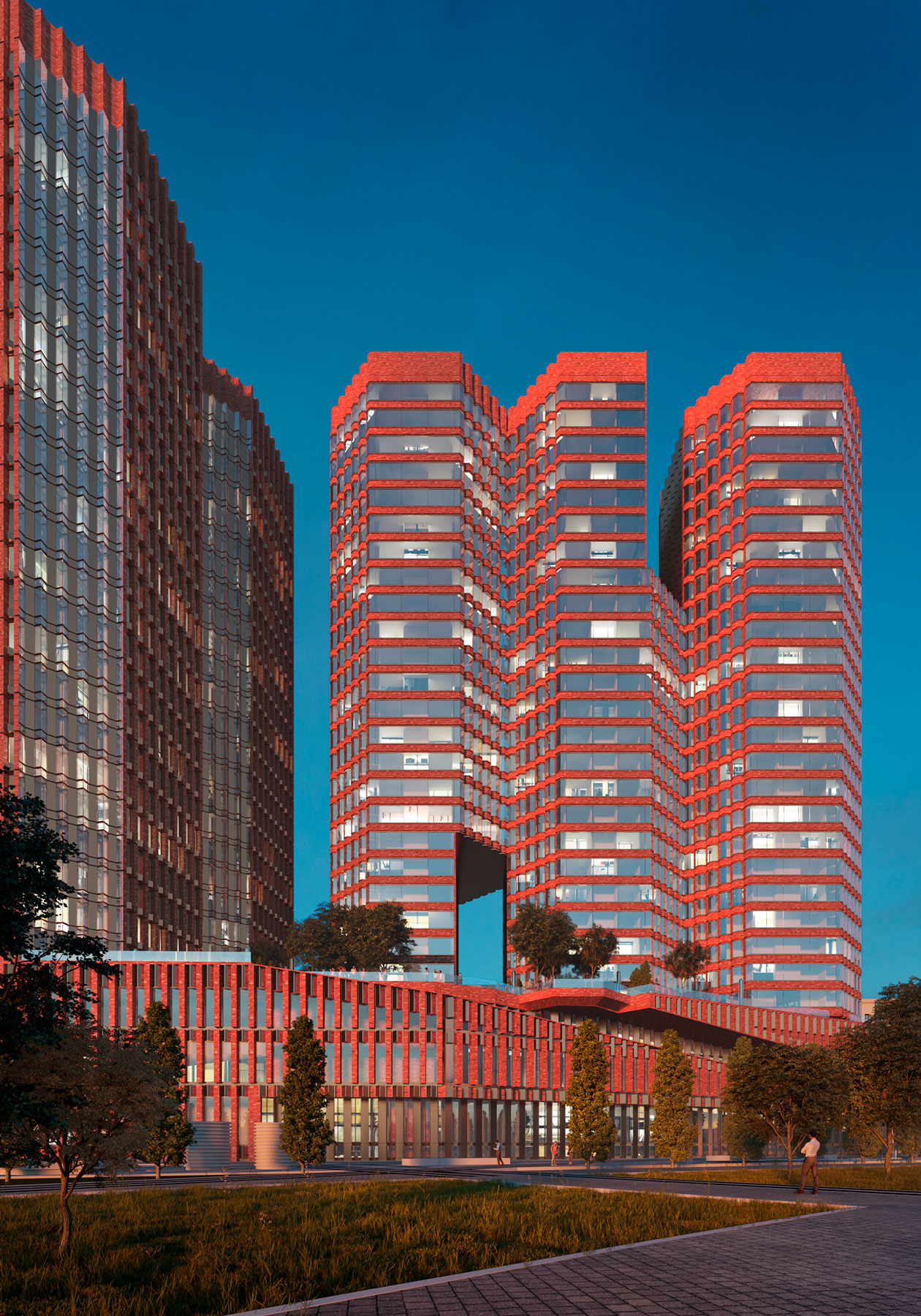 Концептуальным прототипом объекта стало здание Электрозавода, построенное в 1916 г. Здание разделено на общественную часть, размещенную в трехэтажном стилобате, и жилую, расположенную в четырех башнях-секциях.